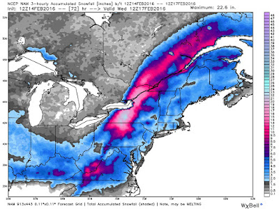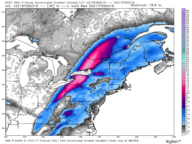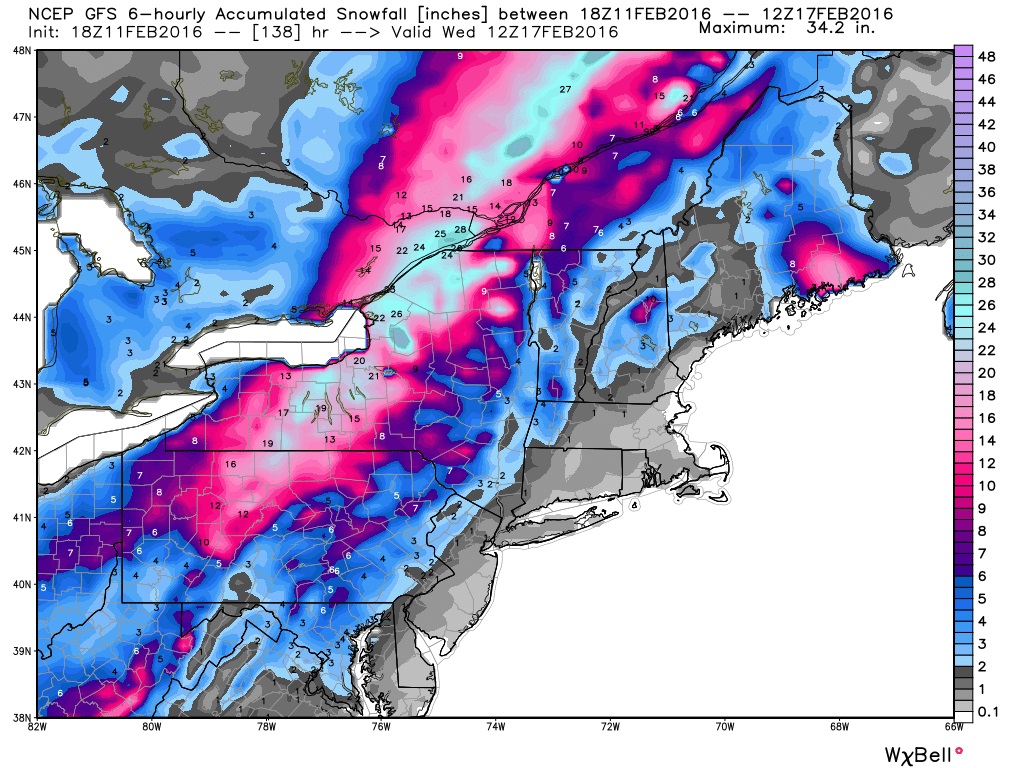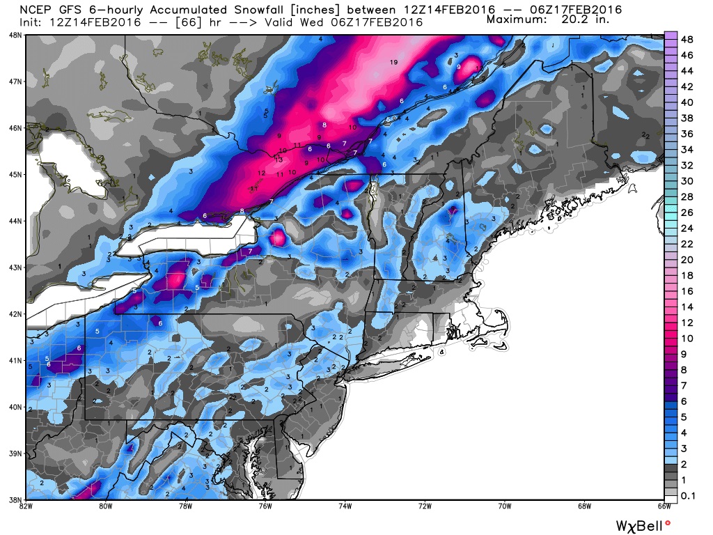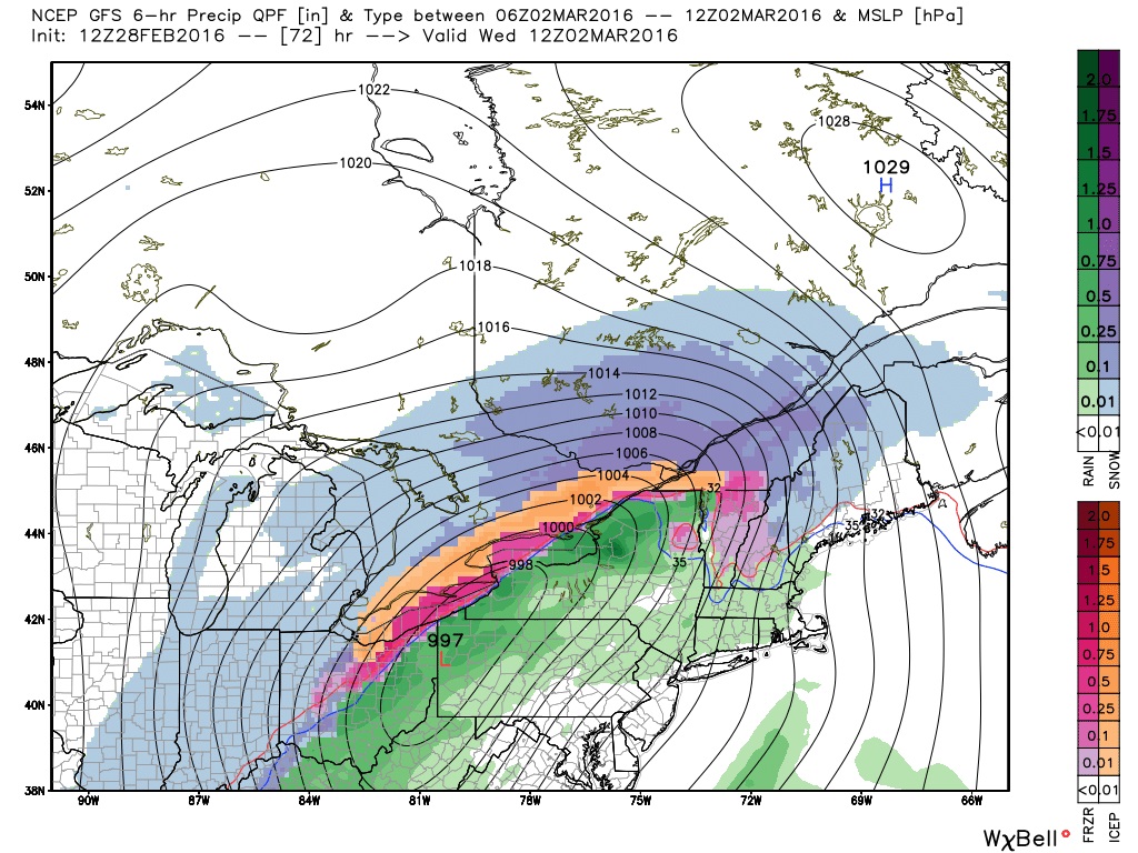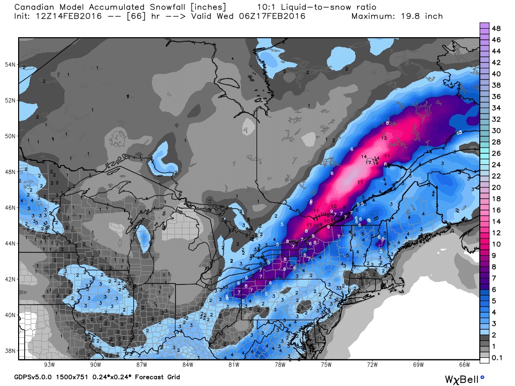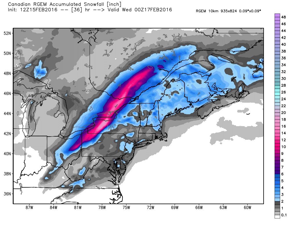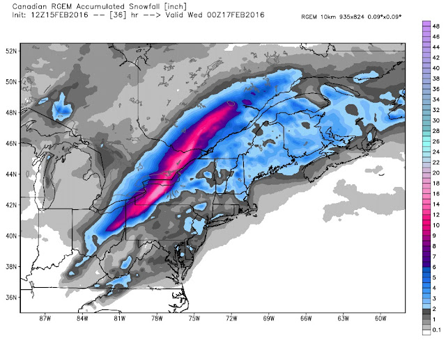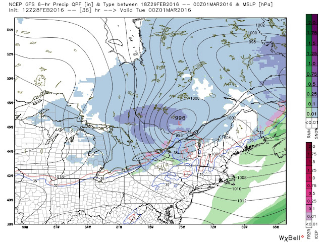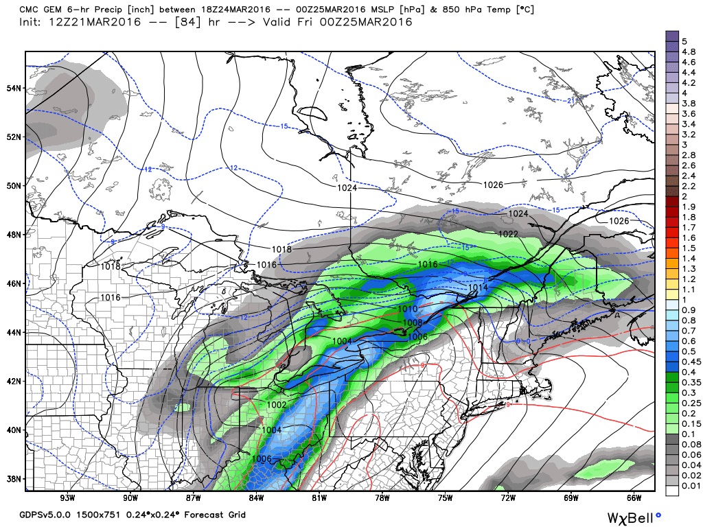 The CGEM solution has the storm center sliding over Lake Erie to just south of Lake Ontario with a slower track. Thursday evening it has the storm over Lake Erie (map below). This will give more snow and a brief mix of ice.