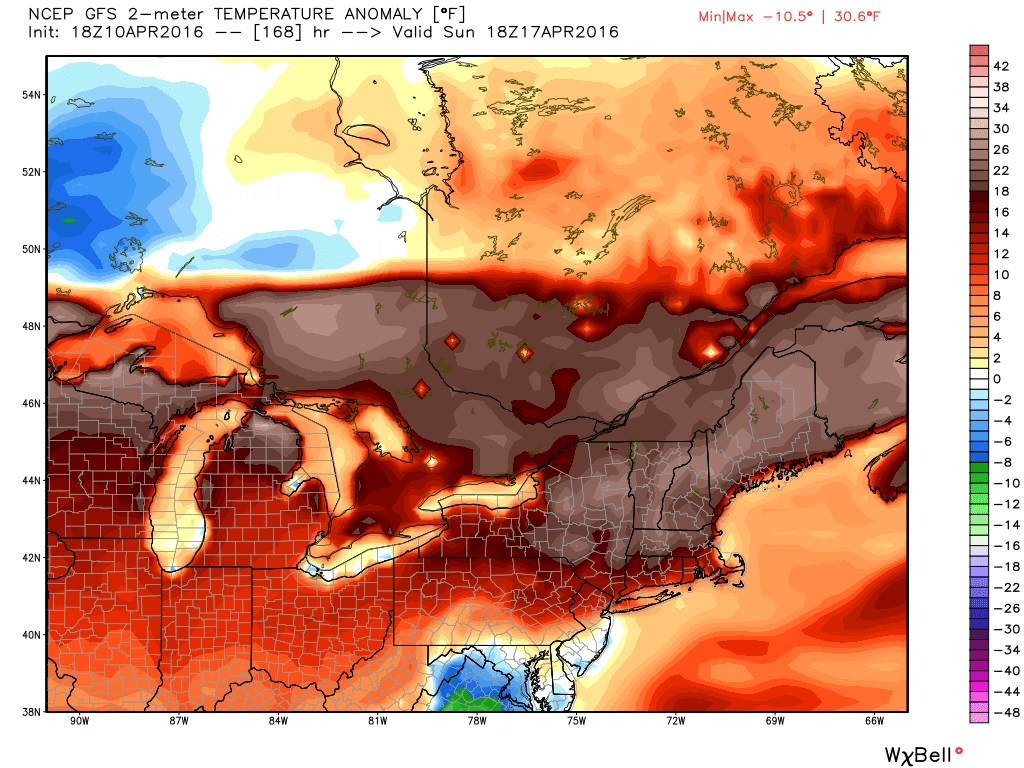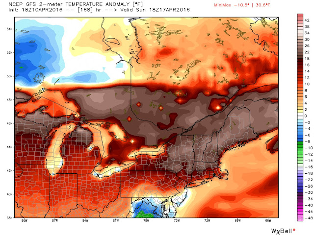 For example, the GFS has this nice burnt umber colour positive temperature anomaly for our area next Sunday (map courtesy of Weatherbell). In fact, the GFS has no below 0 C temperatures day 6 thru 10 in Ottawa. Safe for the flowers to come now. Perhaps.